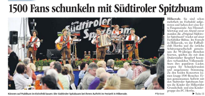 Auf viele Besucher aus der gesamten Region sind die Sportler und Schützen beim Gastspiel der Spitzbuam eingestellt. Schließlich zählt die Band aus dem norditalienischen Partschins zu den Spitzengruppen der Volksmusik in Europa. Außerdem sind die Musiker aus Südtirol seit vielen Jahren mit Hilkerode und dem Eichsfeld auch freundschaftlich verbandelt. Der Hilkeröder Franz-Josef Wiegmann hat seinen Freunden auf seinem Grundstück sogar eine „Spitzbuam-Straße“ gewidmet.