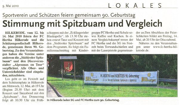 Hilkerode (sr). Mit einem großen Festprogramm warten die Schützengesellschaft Hilkerode und der Sportverein Herta Hilkerode aus Anlass ihres 90. Geburtstages gemeinsam auf. Gefeiert wird ab Mittwoch 12. Mai, bis Freitag, 13. Mai, im Festzelt auf dem Schützenplatz. Den Reigen der Festivitäten eröffnet am Mittwoch, 12. Mai, ein Konzert- und Tanzabend mit den Südtiroler Spitzbuam.Der Donnerstag wird mit einem Frühschoppen um 11 Uhr eröffnet, ab 13.30 geben die Südtiroler Spitzbuam ein weiteres Konzert. Es folgt ein Familiennachmittag mit Kaffee und Kuchen sowie einem Vergleichswettkampf in Torwandschießen und der Laserpistole zwischen dem FC Herta und der SG. Am Freitag schließlich steigt ab 20 Uhr eine Disco mit Alpenmax on Tour. Der Kartenvorverkauf für die verschiedenen Veranstaltungen ist bereits angelaufen. Angeboten werden die Billets in den Sparkassenfilialen Hilkerode und Rhumspringe, bei der Firma Awie in der Duderstädter Marktstraße sowie beim 1. Vorsitzenden des FC Herta, Matthias Conrady, und beim 1. Vorsitzenden der Schützengesellschaft, Clemens Müller.