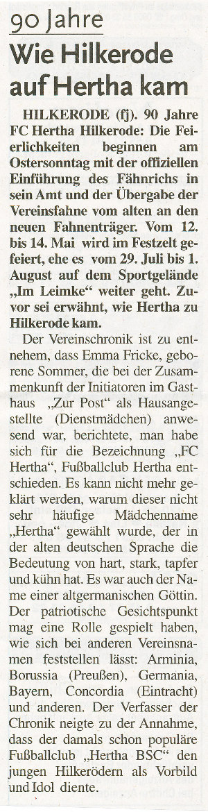 Hilkerode (asg). Mit Umzügen, Gottesdienst und Kranzniederlegung feiert der Sportverein FC Hertha Hilkerode am Ostersonntag, 4. April, sein 90. Stiftungsfest. Die Festivitäten beginnen an diesem Tag bereits um 8.30 Uhr mit einem Gottesdienst für alle Vereinsmitglieder in der Kirche St. Johannes. Um 14.45 Uhr ist das nächste Treffen am Vereinslokal Zum Holztal angesetzt, von da aus folgt um 15 Uhr der Abmarsch zum Ehrenmal mit dem noch amtierenden Fähnrich Christoph Conrady. Im Rahmen der feierlichen Kranzniederlegung wird am Ehrenmal der verstorbenen Vereinsmitglieder gedacht. Nach der Rückkehr zum Vereinslokal erfolgt um 15.45 Uhr die Fahnenübergabe an den neuen Fähnrich Richard Neuner, Fahnenbegleiter sind Martin Conrady und Michael Wetzko. Gegen 16.30 Uhr geht es zum Haus des neuen Fähnrichs, wobei der Zug vom örtlichen Spielmannszug begleitet wird. Weiterer Höhepunkt des Geburtstages wird die „Schwarz-weiße Ballnacht“, die um 20 Uhr im Vereinslokal Zum Holztal beginnt. Für Tanzmusik und Stimmung soll an diesem Abend DJ Benne aus Bad Lauterberg sorgen. Um Teilnahme aller FC-Mitglieder wird nicht nur an den Terminen während des Festtages gebeten, sondern insbesondere auch am Vereinsball, da in diesem Rahmen langjährige und verdiente Mitglieder ausgezeichnet werden sollen. Auch Freunde und Gönner des Vereins sind bei jeder Veranstaltung gern gesehen.